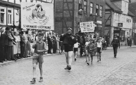 Salatkirmes - Umzug mit Motiv zur Schwimmbaderöffnung (1953)